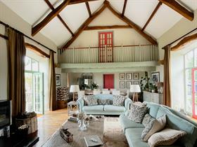 The lounge is a visually striking room, featuring exposed beams and preserving the original barn characteristics with an open apex. Three sofas and two armchairs create a cosy seating area around the log burning stove. Enjoy access to various streaming services on a smart TV. Including French doors on both sides creates a light atmosphere in the room. The front of the barn is accessible through one set of doors, while the patio and garden lounge can be reached through the other set. There’s a selection of books, board games, and jigsaw puzzles available in the lounge and snug. You’ll find a small basket of toys in the lounge area. Bose speakers are perfect for music enthusiasts.