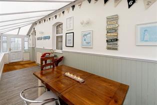 On the ground floor the formal dining room can seat up to nine guests around the ceremonious table. A log burner, Chesterfield sofa, refined armchairs, twinkling chandeliers and a huge polished mirror complete the look. A well-stocked bookcase comes complete with a library of novels all within easy reach. Dining becomes a true culinary occasion here – throw a log on the wood burner and savour the view as the boats slip serenely by in the estuary.